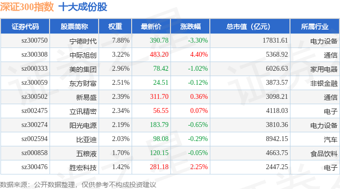 证券之星消息,11月17日,深证300(399007)指数报收于5562.53点,跌0.29%,成交3500.02亿元,换手率1.38%。当日该指数成份股中,上涨的有110家,天华新能以20.0%的涨幅领涨,下跌的有185家,迈为股份以6.71%的跌幅领跌。