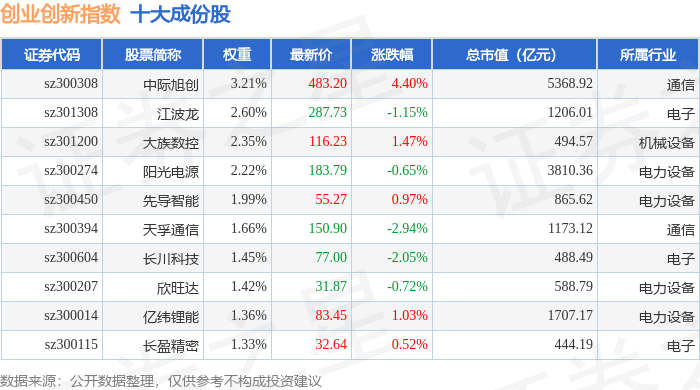 证券之星消息,11月17日,创业创新(399018)指数报收于5757.72点,跌0.23%,成交1158.37亿元,换手率2.83%。当日该指数成份股中,上涨的有46家,新宙邦以5.8%的涨幅领涨,下跌的有53家,迈为股份以6.71%的跌幅领跌。