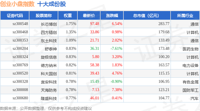 证券之星消息,11月17日,创业小盘(399020)指数报收于1744.92点,涨1.14%,成交834.6亿元,换手率4.32%。当日该指数成份股中,上涨的有196家,中富通以20.02%的涨幅领涨,下跌的有103家,舒泰神以7.61%的跌幅领跌。