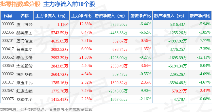 资金流向方面,批零指数(399236)成份股当日主力资金净流出合计16.58亿元,游资资金净流入合计8385.12万元,散户资金净流入合计15.74亿元。成份股资金流向详情见下表: