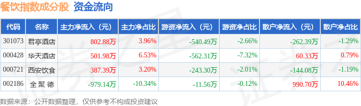 资金流向方面,餐饮指数(399238)成份股当日主力资金净流入合计713.11万元,游资资金净流出合计1357.67万元,散户资金净流入合计644.56万元。成份股资金流向详情见下表: