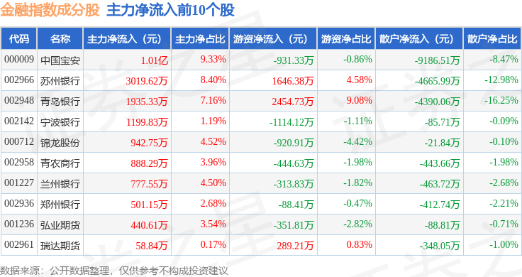 资金流向方面,金融指数(399240)成份股当日主力资金净流出合计13.17亿元,游资资金净流入合计5.12亿元,散户资金净流入合计8.04亿元。成份股资金流向详情见下表: