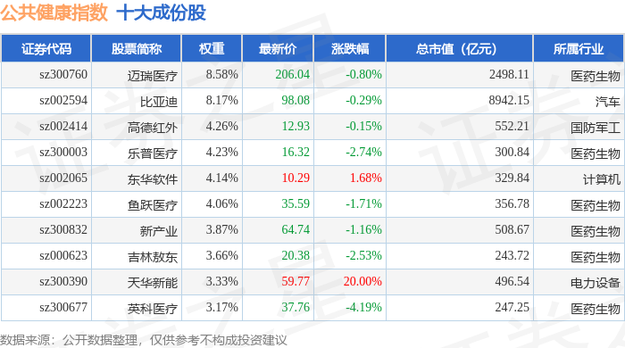 证券之星消息,11月17日,公共健康(399277)指数报收于2899.45点,涨0.39%,成交295.31亿元,换手率3.15%。当日该指数成份股中,上涨的有18家,天华新能以20.0%的涨幅领涨,下跌的有30家,舒泰神以7.61%的跌幅领跌。