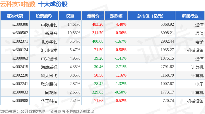 证券之星消息,11月17日,云科技50(399279)指数报收于4482.95点,涨0.71%,成交734.5亿元,换手率1.83%。当日该指数成份股中,上涨的有31家,中际旭创以4.4%的涨幅领涨,下跌的有19家,亿联网络以3.15%的跌幅领跌。