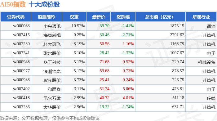证券之星消息,11月17日,AI50(399284)指数报收于3755.71点,涨0.58%,成交397.1亿元,换手率2.14%。当日该指数成份股中,上涨的有42家,东方国信以12.89%的涨幅领涨,下跌的有8家,海康威视以2.71%的跌幅领跌。