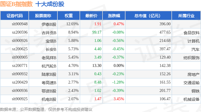 证券之星消息,11月17日,国证B指(399318)指数报收于5249.09点,跌0.24%,成交1.47亿元,换手率0.13%。当日该指数成份股中,上涨的有19家,机电B股以3.45%的涨幅领涨,下跌的有51家,海立B股以4.18%的跌幅领跌。