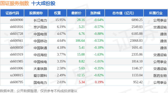 证券之星消息,11月17日,国证服务(399320)指数报收于2225.33点,跌0.62%,成交386.22亿元,换手率0.66%。当日该指数成份股中,上涨的有20家,瀚蓝环境以2.5%的涨幅领涨,下跌的有77家,吉祥航空以3.04%的跌幅领跌。