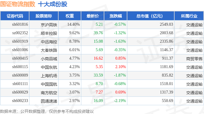 证券之星消息,11月17日,国证物流(399353)指数报收于2172.69点,跌0.7%,成交155.86亿元,换手率0.6%。当日该指数成份股中,上涨的有11家,恒逸石化以4.13%的涨幅领涨,下跌的有28家,春秋航空以5.04%的跌幅领跌。