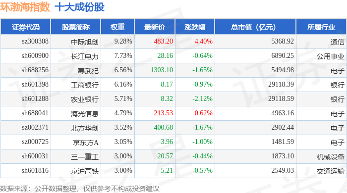 证券之星消息,11月17日,环渤海(399357)指数报收于3541.66点,跌0.08%,成交745.48亿元,换手率0.27%。当日该指数成份股中,上涨的有12家,中际旭创以4.4%的涨幅领涨,下跌的有27家,中国人保以2.5%的跌幅领跌。