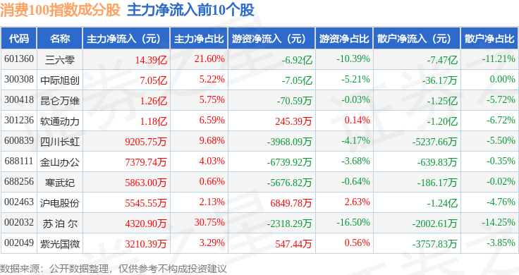 资金流向方面,消费100(399364)指数成份股当日主力资金净流出合计71.91亿元,游资资金净流入合计13.36亿元,散户资金净流入合计58.54亿元。成份股资金流向详情见下表: