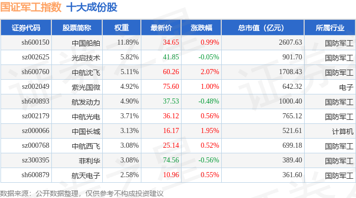 证券之星消息,11月17日,国证军工(399368)指数报收于7609.04点,涨1.09%,成交371.03亿元,换手率1.76%。当日该指数成份股中,上涨的有42家,华丰科技以8.05%的涨幅领涨,下跌的有7家,中国卫通以0.83%的跌幅领跌。