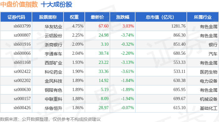 证券之星消息,11月17日,中盘价值(399375)指数报收于5832.14点,跌1.04%,成交551.53亿元,换手率1.46%。当日该指数成份股中,上涨的有18家,华友钴业以3.03%的涨幅领涨,下跌的有79家,云铝股份以3.74%的跌幅领跌。