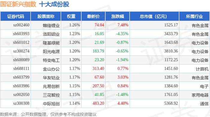 证券之星消息,11月17日,国证新兴(399392)指数报收于2973.48点,跌0.19%,成交2415.36亿元,换手率0.94%。当日该指数成份股中,上涨的有35家,三六零以10.01%的涨幅领涨,下跌的有63家,洛阳钼业以4.35%的跌幅领跌。