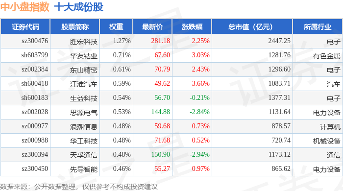 证券之星消息,11月17日,中小盘(399401)指数报收于4702.9点,涨0.0%,成交5270.18亿元,换手率1.79%。当日该指数成份股中,上涨的有309家,容百科技以20.0%的涨幅领涨,下跌的有474家,迈为股份以6.71%的跌幅领跌。