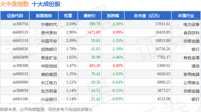 大中盘(399400)指数十大成份股详情如下: