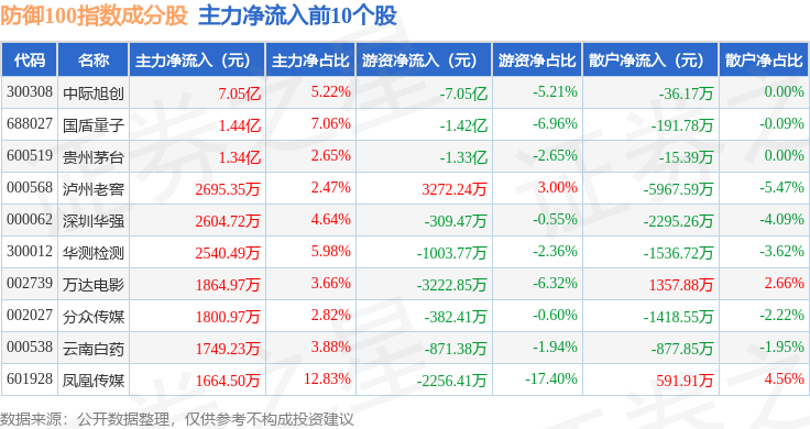 资金流向方面,防御100(399403)指数成份股当日主力资金净流出合计42.95亿元,游资资金净流入合计2.1亿元,散户资金净流入合计40.85亿元。成份股资金流向详情见下表: