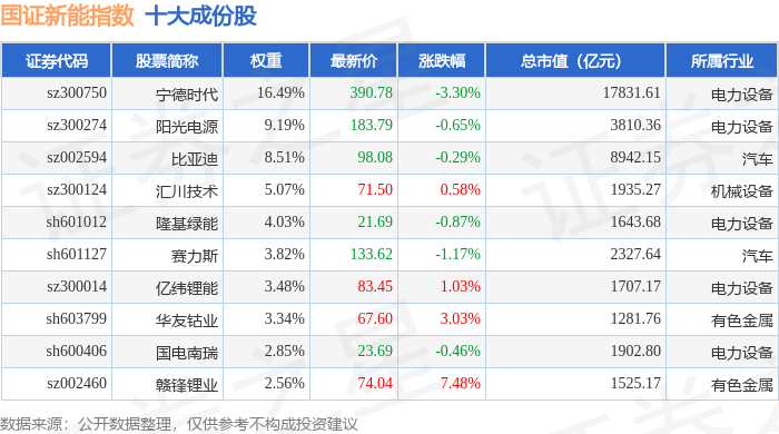 证券之星消息,11月17日,国证新能(399412)指数报收于3131.32点,跌0.66%,成交1304.75亿元,换手率1.69%。当日该指数成份股中,上涨的有14家,赣锋锂业以7.48%的涨幅领涨,下跌的有35家,迈为股份以6.71%的跌幅领跌。