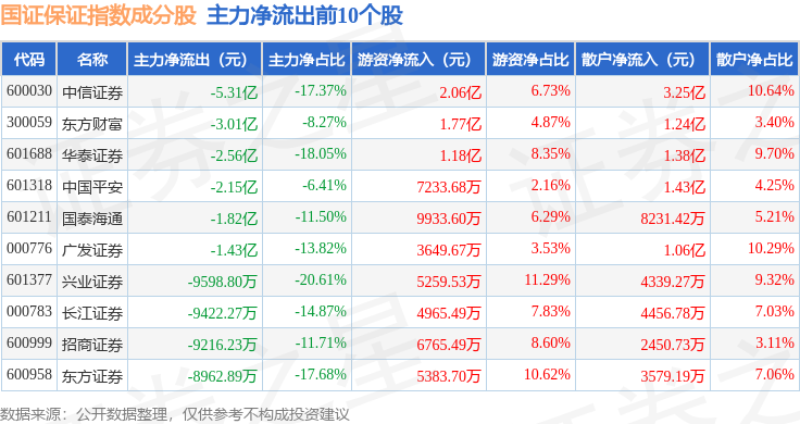 资金流向方面,国证保证(399420)指数成份股当日主力资金净流出合计28.49亿元,游资资金净流入合计10.99亿元,散户资金净流入合计17.5亿元。成份股资金流向详情见下表:
