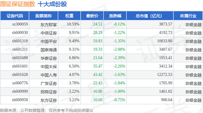 证券之星消息,11月17日,国证保证(399420)指数报收于1529.53点,跌1.3%,成交250.21亿元,换手率0.57%。当日该指数成份股中,上涨的有2家,天风证券以0.2%的涨幅领涨,下跌的有28家,中国人保以2.5%的跌幅领跌。