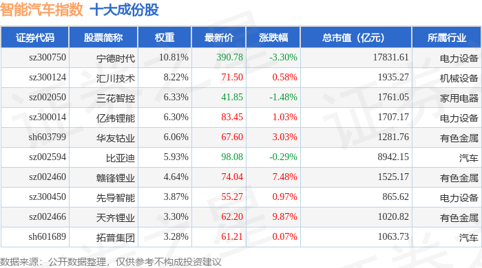 证券之星消息,11月17日,智能汽车(399432)指数报收于6772.81点,涨1.2%,成交1023.7亿元,换手率3.16%。当日该指数成份股中,上涨的有28家,天华新能以20.0%的涨幅领涨,下跌的有21家,宁德时代以3.3%的跌幅领跌。