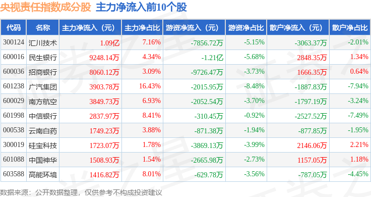 资金流向方面,央视责任(399555)指数成份股当日主力资金净流出合计17.55亿元,游资资金净流出合计2596.38万元,散户资金净流入合计17.81亿元。成份股资金流向详情见下表: