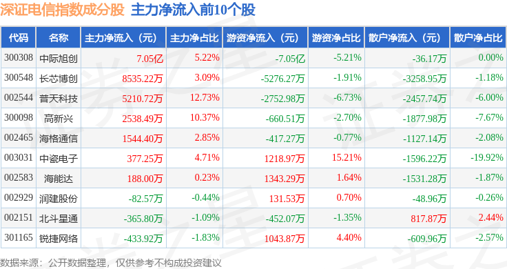 资金流向方面,深证电信(399621)指数成份股当日主力资金净流出合计10.95亿元,游资资金净流出合计3.98亿元,散户资金净流入合计14.93亿元。成份股资金流向详情见下表: