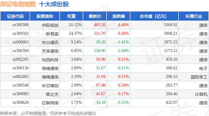 深证电信(399621)指数十大成份股详情如下: