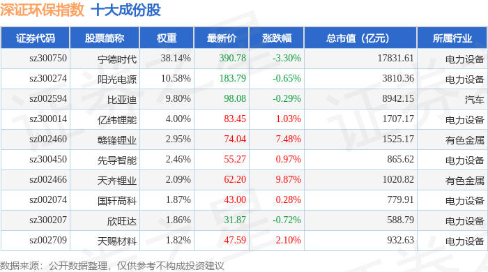 证券之星消息,11月17日,深证环保(399638)指数报收于7893.24点,跌0.78%,成交1129.22亿元,换手率2.04%。当日该指数成份股中,上涨的有16家,天华新能以20.0%的涨幅领涨,下跌的有23家,迈为股份以6.71%的跌幅领跌。