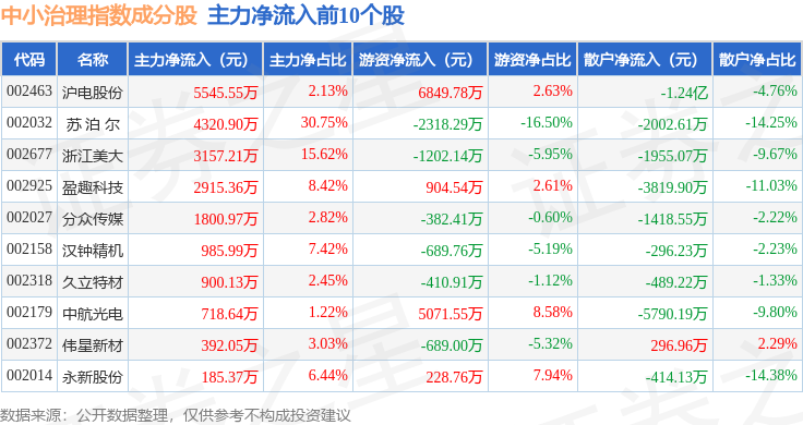 资金流向方面,中小治理(399650)指数成份股当日主力资金净流出合计21.12亿元,游资资金净流入合计5.52亿元,散户资金净流入合计15.59亿元。成份股资金流向详情见下表: