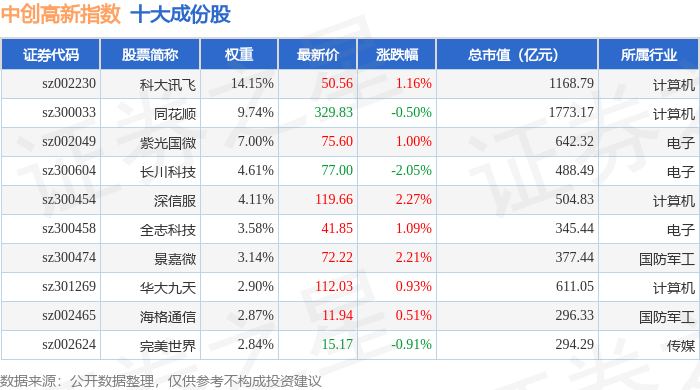 证券之星消息,11月17日,中创高新(399652)指数报收于3539.77点,涨1.06%,成交272.83亿元,换手率3.2%。当日该指数成份股中,上涨的有38家,中孚信息以20.0%的涨幅领涨,下跌的有12家,舒泰神以7.61%的跌幅领跌。