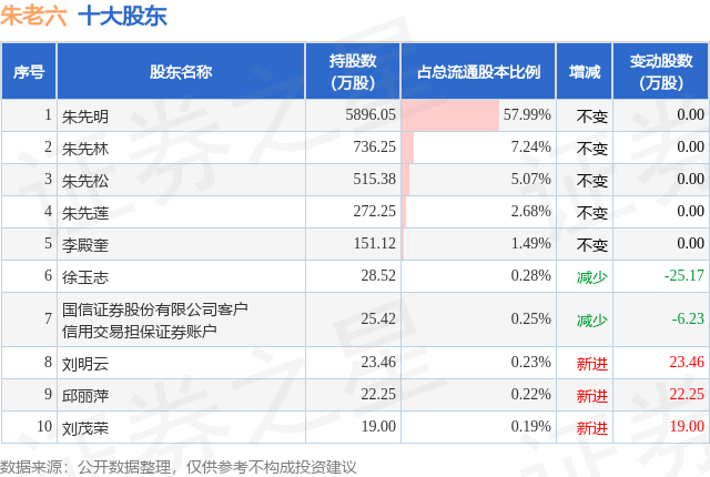 根据朱老六2025年三季报公布的十大股东详情如下: