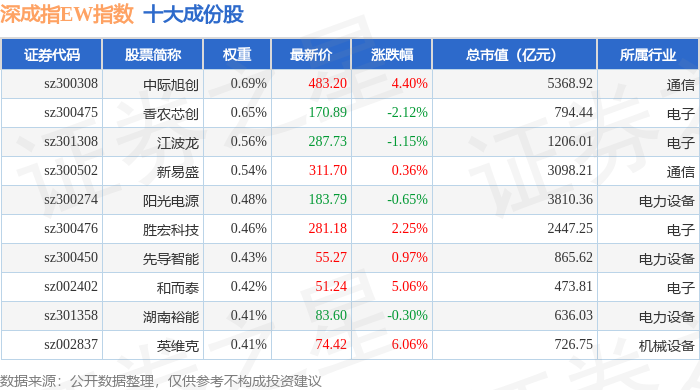 证券之星消息,11月17日,深成指EW(399659)指数报收于4662.03点,涨0.26%,成交4835.11亿元,换手率1.76%。当日该指数成份股中,上涨的有209家,天华新能以20.0%的涨幅领涨,下跌的有284家,迈为股份以6.71%的跌幅领跌。