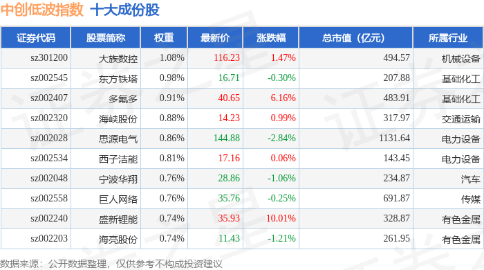 证券之星消息,11月17日,中创低波(399665)指数报收于2384.82点,跌0.23%,成交1336.23亿元,换手率1.55%。当日该指数成份股中,上涨的有65家,盛新锂能以10.01%的涨幅领涨,下跌的有131家,以岭药业以5.42%的跌幅领跌。