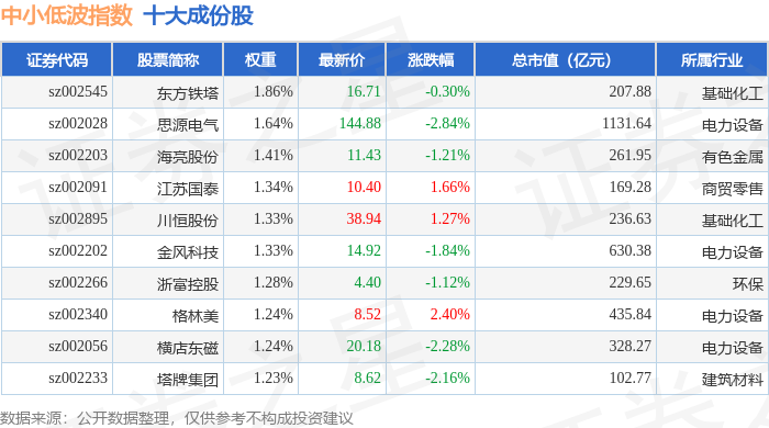 证券之星消息,11月17日,中小低波(399663)指数报收于2005.52点,跌0.94%,成交405.35亿元,换手率1.11%。当日该指数成份股中,上涨的有25家,京新药业以4.2%的涨幅领涨,下跌的有73家,以岭药业以5.42%的跌幅领跌。