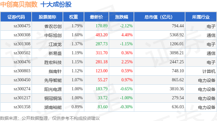 中创高贝(399666)指数十大成份股详情如下:
