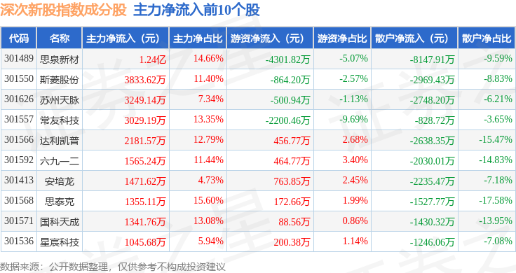 资金流向方面,深次新股(399678)指数成份股当日主力资金净流出合计1.27亿元,游资资金净流入合计2356.37万元,散户资金净流入合计1.04亿元。成份股资金流向详情见下表: