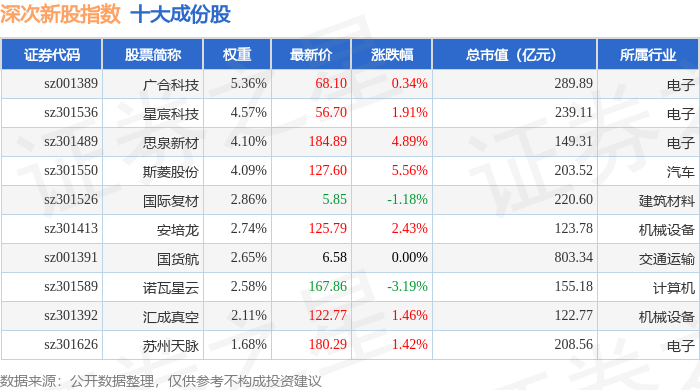 证券之星消息,11月17日,深次新股(399678)指数报收于575.37点,涨0.29%,成交129.14亿元,换手率3.79%。当日该指数成份股中,上涨的有41家,宏工科技以12.34%的涨幅领涨,下跌的有57家,古麒绒材以9.62%的跌幅领跌。