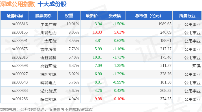深成公用(399689)指数十大成份股详情如下: