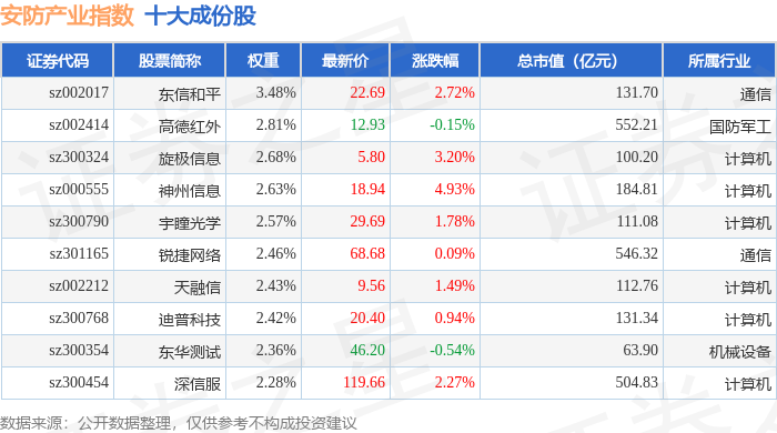 证券之星消息,11月17日,安防产业(399693)指数报收于4911.08点,涨1.73%,成交219.12亿元,换手率2.47%。当日该指数成份股中,上涨的有45家,航天发展以9.99%的涨幅领涨,下跌的有5家,海康威视以2.71%的跌幅领跌。