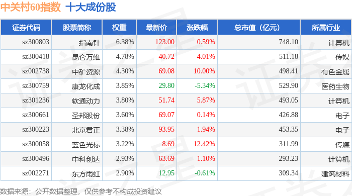 中关村60(399697)指数十大成份股详情如下: