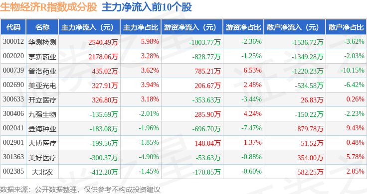 资金流向方面,生物经济R(470038)指数成份股当日主力资金净流出合计18.96亿元,游资资金净流入合计3.6亿元,散户资金净流入合计15.36亿元。成份股资金流向详情见下表: