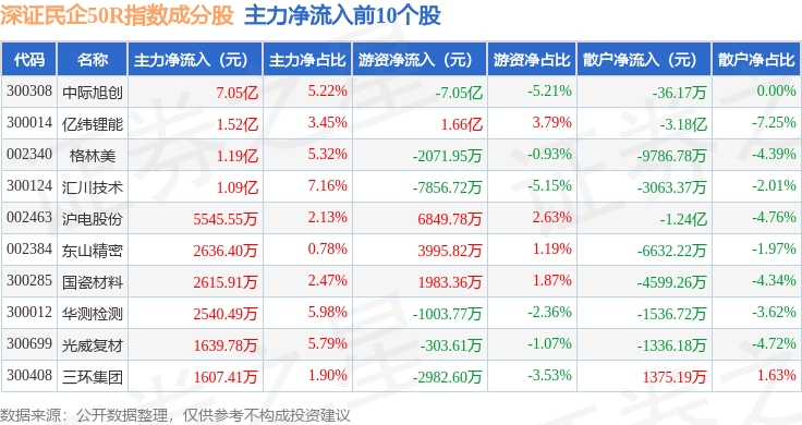 资金流向方面,深证民企50R(470057)指数成份股当日主力资金净流出合计70.97亿元,游资资金净流入合计19.72亿元,散户资金净流入合计51.25亿元。成份股资金流向详情见下表: