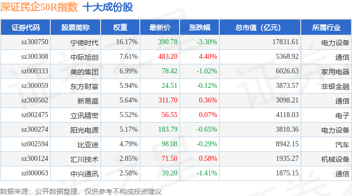 证券之星消息,11月17日,深证民企50R(470057)指数报收于3839.37点,跌0.71%,成交1198.53亿元,换手率1.47%。当日该指数成份股中,上涨的有14家,中际旭创以4.4%的涨幅领涨,下跌的有36家,康龙化成以5.34%的跌幅领跌。