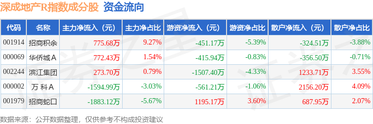 资金流向方面,深成地产R(471001)指数成份股当日主力资金净流出合计1656.31万元,游资资金净流出合计1740.55万元,散户资金净流入合计3396.86万元。成份股资金流向详情见下表: