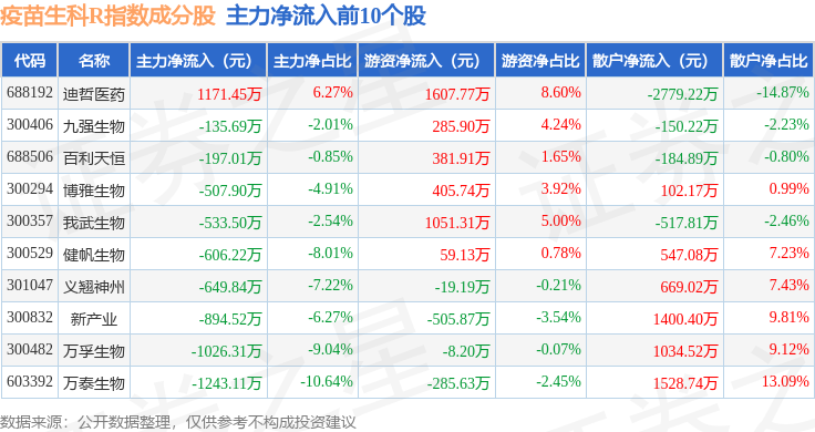 资金流向方面,疫苗生科R(480015)指数成份股当日主力资金净流出合计27.39亿元,游资资金净流入合计7.93亿元,散户资金净流入合计19.46亿元。成份股资金流向详情见下表: