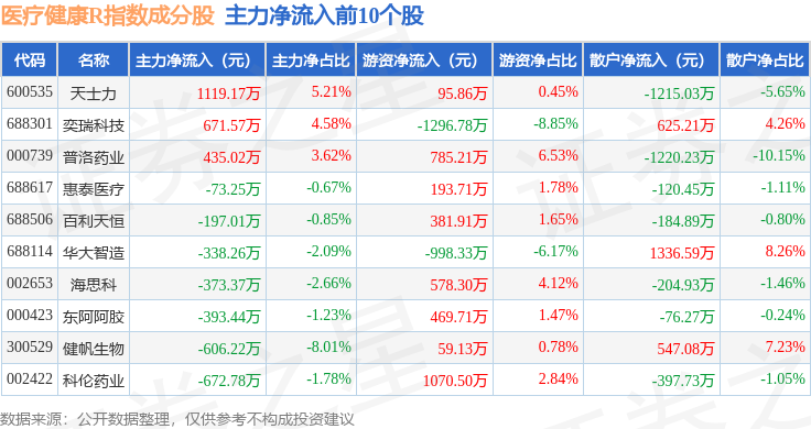 资金流向方面,医疗健康R(480016)指数成份股当日主力资金净流出合计26.44亿元,游资资金净流入合计8.89亿元,散户资金净流入合计17.55亿元。成份股资金流向详情见下表: