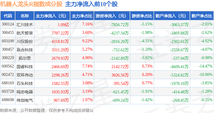 资金流向方面,机器人龙头R(480071)指数成份股当日主力资金净流出合计5.25亿元,游资资金净流入合计1.1亿元,散户资金净流入合计4.15亿元。成份股资金流向详情见下表: