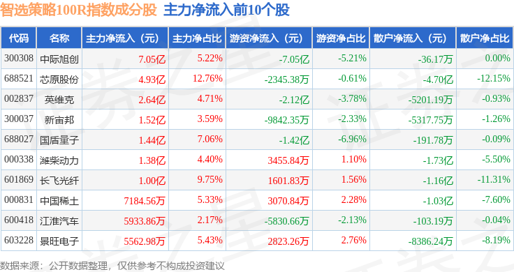 资金流向方面,智选策略100R(489015)指数成份股当日主力资金净流出合计21.13亿元,游资资金净流入合计9.1亿元,散户资金净流入合计12.04亿元。成份股资金流向详情见下表: