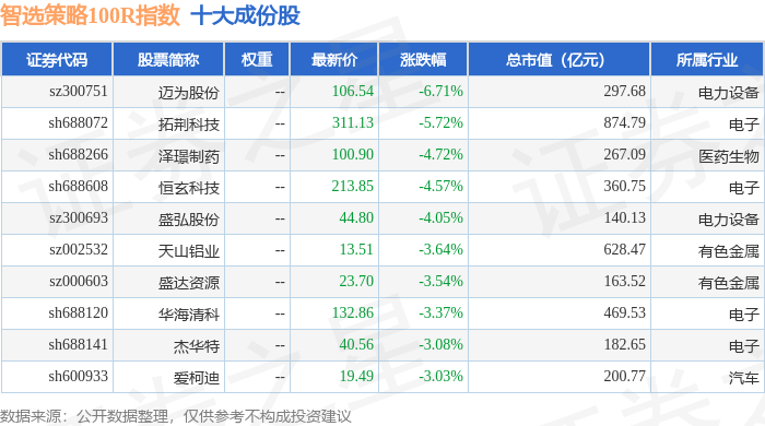 证券之星消息,11月17日,智选策略100R(489015)指数报收于4733.63点,跌0.41%,成交1586.96亿元,换手率2.54%。当日该指数成份股中,上涨的有41家,芯原股份以7.75%的涨幅领涨,下跌的有58家,迈为股份以6.71%的跌幅领跌。