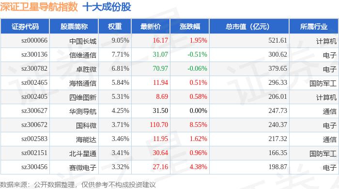 证券之星消息,11月17日,深证卫星导航(970050)指数报收于3237.27点,涨1.81%,成交159.7亿元,换手率3.2%。当日该指数成份股中,上涨的有34家,晨曦航空以11.97%的涨幅领涨,下跌的有6家,天奥电子以1.16%的跌幅领跌。